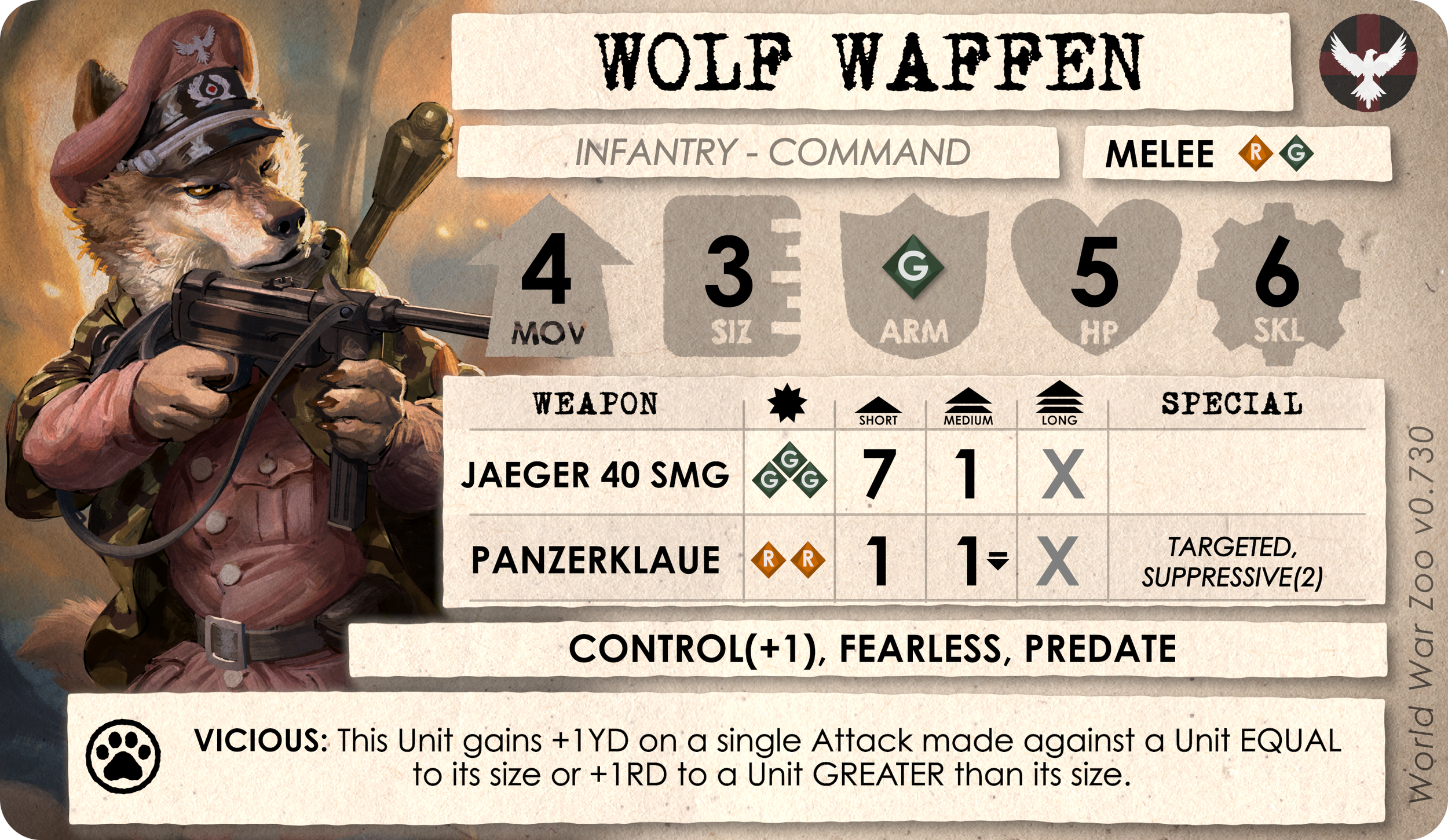 The Size 3 Wolf Waffen can use its VICIOUS Instinct to gain bonus attack dice against a unit of equal, and an even better bonus against a LARGER opponent.